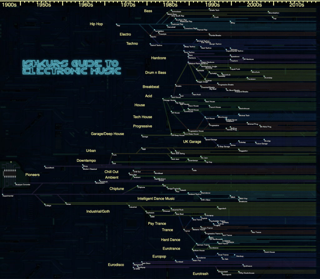 Furthermore, if you’re a supreme subgenre nerd and want a full timeline of over 100 subgenres with examples, check out Ishkur’s Guide to Electronic Music. Definitely a great resource.